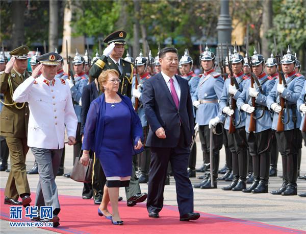 11月22日,國家主席習近平在圣地亞哥同智利總統巴切萊特舉行會談。這是會談前,習近平出席巴切萊特在憲法廣場舉行的隆重歡迎儀式。新華社記者 王曄 攝