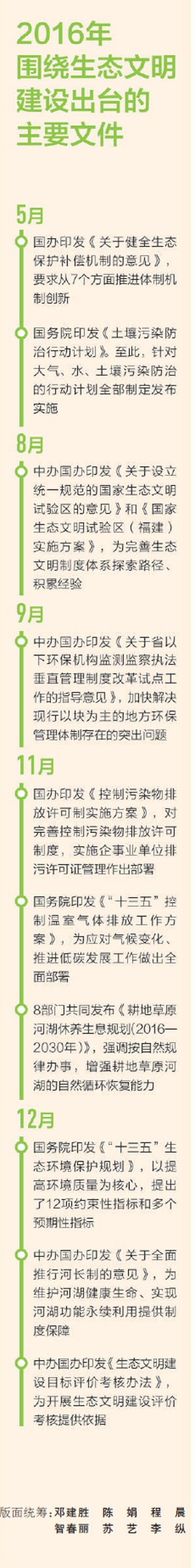 盤點2016年生態環保領域大事,令人振奮。從中央環保督察制度形成到省以下環保機構垂直管理試點,從國家生態文明試驗區試點到生態環境損害賠償制度試點,生態文明制度建設已經按下快進鍵,改革步伐加快,成果有目共睹。