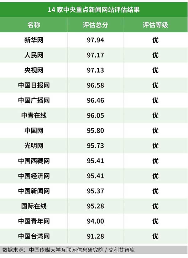 12月,網站信息生態整體表現良好。14家中央重點新聞網站平均總分為95.68分,網站信息生態狀況整體表現為優。新華網、人民網、央視網位列本期評估前三甲,在信息生產傳播與創新能力、內容安全保障等多方面能力較強。評估總分情況如下:
