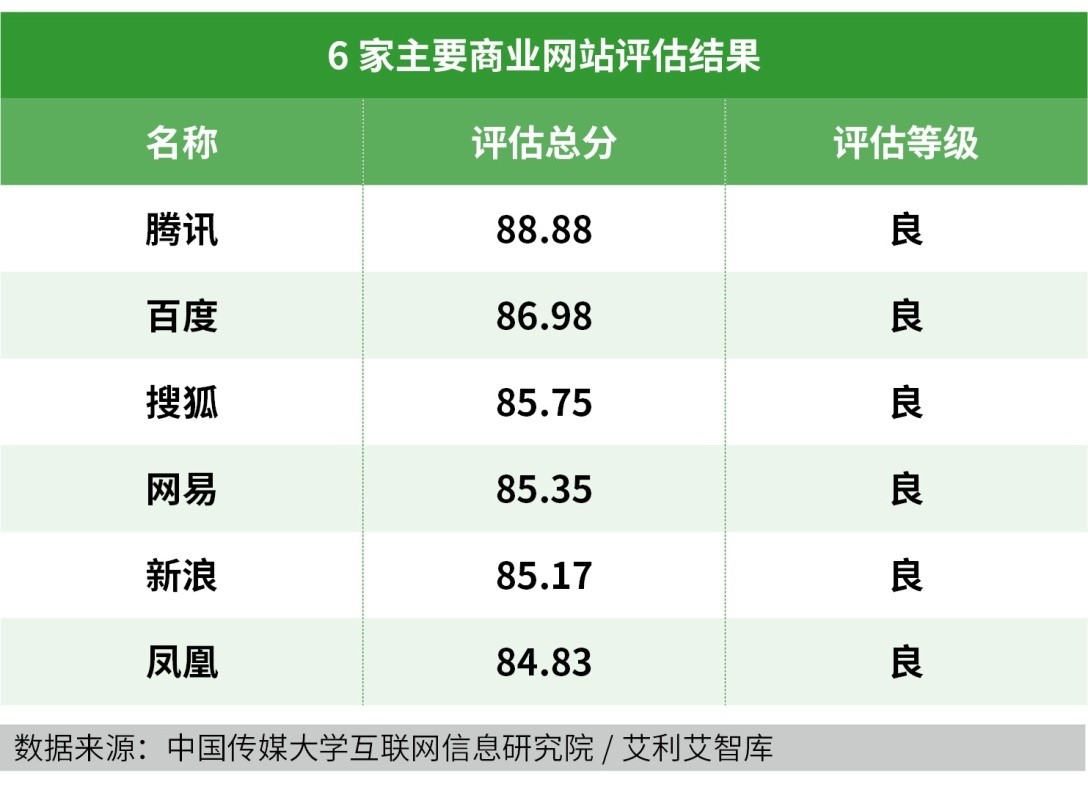 6家主要商業網站平均總分為86.16分,網站信息生態總體表現為良。騰訊、百度、搜狐憑借高響應度以及內容安全保障能力表現較好,優于其他商業網站。評估總分情況如下:
