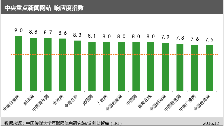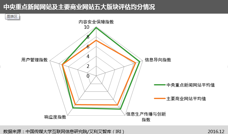 信息生產傳播與創新方面、信息導向以及內容安全保障方面,中央重點新聞網站表現較好,各網站之間差異不大;用戶管理、響應度方面,整體仍還需要加強。