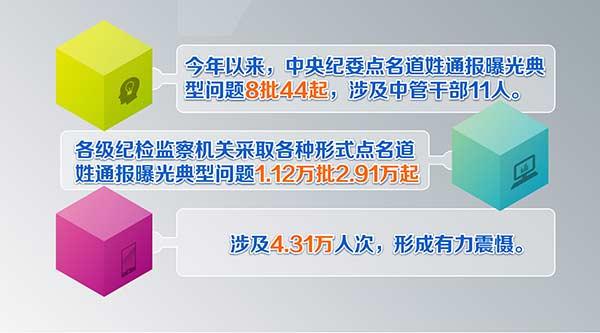 年初,中央紀委提出明確要求,對2016年1月1日以后發(fā)生的違反中央八項規(guī)定精神受到黨紀政紀處分人員,原則上都要點名道姓通報曝光。今年以來,中央紀委點名道姓通報曝光典型問題8批44起,涉及中管干部11人。各級紀檢監(jiān)察機關采取各種形式點名道姓通報曝光典型問題1.12萬批2.91萬起,涉及4.31萬人次,形成有力震懾。