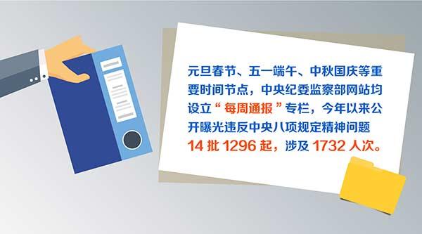 中央紀委堅持月報制度,每月定期公布《全國查處違反中央八項規(guī)定精神問題匯總表》。元旦春節(jié)、五一端午、中秋國慶等重要時間節(jié)點,中央紀委監(jiān)察部網(wǎng)站均設立“每周通報”專欄,今年以來公開曝光違反中央八項規(guī)定精神問題14批1296起,涉及1732人次。