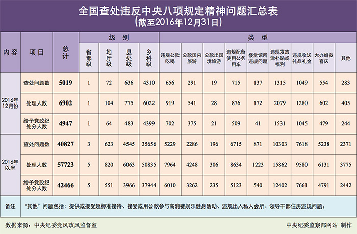 為掌握全國貫徹落實中央八項規定精神情況,中央紀委在31個省區市和新疆生產建設兵團、139個中央和國家機關、102個中央企業、15個中央金融企業建立了落實中央八項規定精神情況月報制度。2016年以來,截至12月31日,全國查處違反中央八項規定精神問題情況如下: