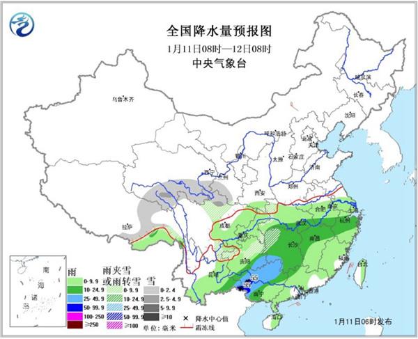今天,南方雨雪繼續,也是此輪降水最為強盛的一天。中央氣象臺預計,11日08時至12日08時,四川西北部、湖北西部、湖南西北部、貴州中部和東北部等地有小雪或雨夾雪,局地中雪;西南地區東部、江漢、江淮、江南、華南等地有小到中雨,其中,廣西西部和北部、貴州東南部、湖南西南部等地有大雨,局地暴雨。