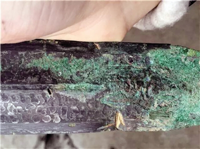 二是劍身呈黑色的地方為黑漆古,黑漆古是由于古銅長期存放在潮濕的地方,其表面生成的一層極穩定的保護薄膜,重慶地區潮濕,劍身有黑漆古出現是合乎常理的。