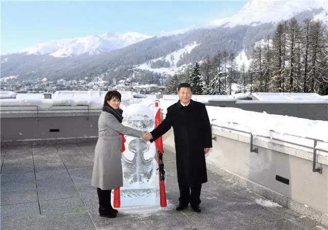 達(dá)沃斯演講之前,瑞士聯(lián)邦主席洛伊特哈德專程趕到習(xí)近平主席下榻的酒店同中國貴賓會面。酒店觀景臺上,一尊可愛的熊貓冰雕上插著中瑞兩國國旗。洛伊特哈德向習(xí)近平主席贈送了一副印有“中瑞旅游年”字樣的紅色滑雪板。兩國元首合影留念,開啟中瑞旅游年的大幕。