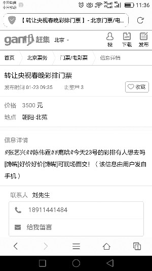 昨天,記者在58同城、閑魚等多家網絡平臺上看到有人出售春晚彩排門票。在趕集網上搜索“春晚彩排門票”,頁面上會跳出六七條相關帖子。其中一則“轉讓央視春晚彩排門票”的帖子,提示當紅明星鹿晗、張藝興彩排等信息,標注的價格為3500元。