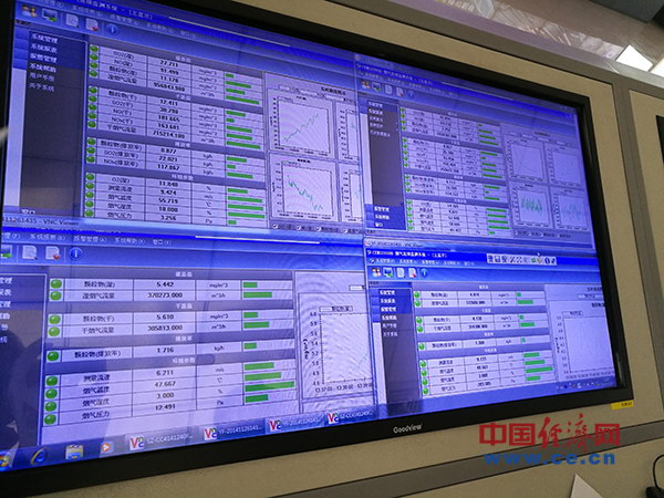 記者在天津天鋼聯合特鋼有限公司主控制中心拍攝到的,與天津市環保局和寧河區環保局實時同步的排污數據。(中國經濟網記者范戴芫 攝)