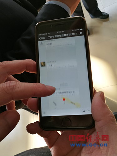 寧河區清新空氣行動指揮部辦公室負責人陳建洋向記者展示群里網格員發送的坐標定位。(中國經濟網記者范戴芫 攝)