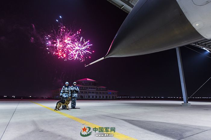 零點過后,城市的煙火漸漸稀松,守歲的人們安心睡去,年輕的戰士和無言的戰友繼續巡邏在戰機旁。