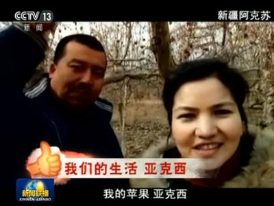 大家新年好,我在新疆阿克蘇,我來看看合作伙伴買買提大叔。這是買買提大叔的蘋果園,買買提大叔的蘋果又香又甜。前些年大叔一直發(fā)愁,自己的蘋果賣不出去。去年我一畢業(yè)回阿克蘇辦起了網(wǎng)店,去年買買提大叔修了新房,我買了新車。買買提大叔的蘋果通過互聯(lián)網(wǎng)賣到了全國各地。厲害了,我的國!我的蘋果,亞克西!我的國,亞克西!