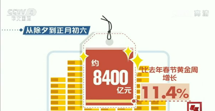 商務部公布的最新數據顯示,從除夕到正月初六全國零售和餐飲企業實現銷售額約8400億元,比去年春節黃金周增長11.4%。傳統年貨、綠色食品等商品熱銷,健康飲食的觀念帶動地方土特產,時令水果、保健禮品等商品銷售大幅增長。