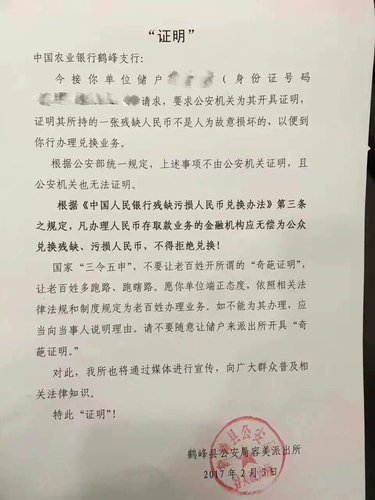 這兩天,一份基層派出所開出的“證明”在網上瘋傳,并贏得了大量網友點贊!事情的起因,是湖北省鶴峰縣一位儲戶去銀行兌換一張殘缺的人民幣,銀行工作人員則要求這位儲戶,去公安機關開具“非人為故意損壞”證明,才可辦理“換錢”。