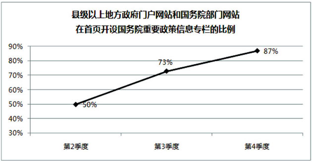 2016年第四季度全國政府網(wǎng)站重要政策信息聯(lián)動發(fā)布水平顯著提升。縣級以上地方政府門戶網(wǎng)站和國務(wù)院部門網(wǎng)站中,有87%在首頁顯著位置開設(shè)了國務(wù)院重要政策信息專欄,78%的網(wǎng)站能夠在國務(wù)院重要信息發(fā)布后24小時內(nèi)進(jìn)行轉(zhuǎn)載,比第三季度分別提高14和18個百分點。