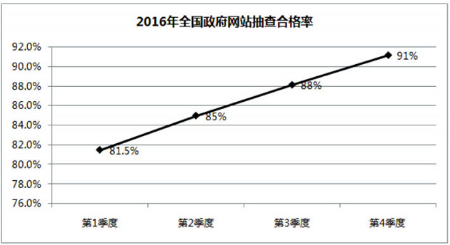 各地區(qū)和71個國務(wù)院部門共抽查本地區(qū)、本部門政府網(wǎng)站7535個,占全國政府網(wǎng)站運行總數(shù)的16%,總體合格率91%。其中,國務(wù)院部門(含內(nèi)設(shè)、垂直管理機構(gòu))政府網(wǎng)站抽查合格率為97.2%,各地區(qū)政府網(wǎng)站抽查合格率為90.8%。抽查發(fā)現(xiàn)的不合格政府網(wǎng)站正在進(jìn)行整改。國務(wù)院辦公廳政府信息與政務(wù)公開辦公室對各地區(qū)、各部門上報的情況進(jìn)行了人工復(fù)核,總體上看,數(shù)據(jù)準(zhǔn)確真實。同時,2016年第三季度發(fā)現(xiàn)的不合格網(wǎng)站中97%已完成整改或關(guān)停上移。