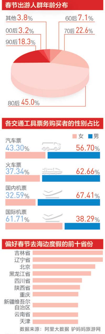 通過大數據觀察,春節游客的組成和出行人數正發生變化。在攜程上,80%以上預訂游客以家庭為單位。旅游專家分析,這說明家庭旅游的趨勢越來越明顯。在中國社會老齡化趨勢、二孩放開的背景下,家庭旅游市場會不斷擴大。