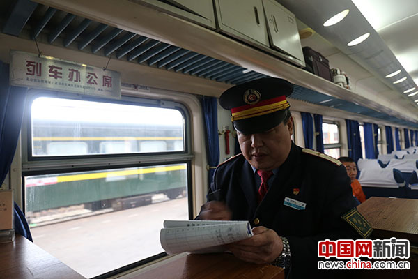 2月14日,K51/52次列車長朱運濤在列車辦公席查閱工作記錄。中國網記者 郭澤涵 攝