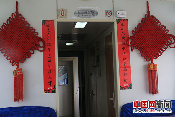 2月14日,K51/52次列車的餐車間懸掛的中國結和春聯。中國網記者 郭澤涵 攝