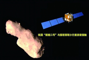 2012年12月13日,中國第二顆月球探測器嫦娥二號圓滿完成探月既定任務和日-地L2點試驗任務之后,在距地球約700萬千米遠的深空,以每秒10千米的相對速度,從圖塔蒂斯小行星身邊飛奔而過,距“戰神”最近的距離約為770米。
