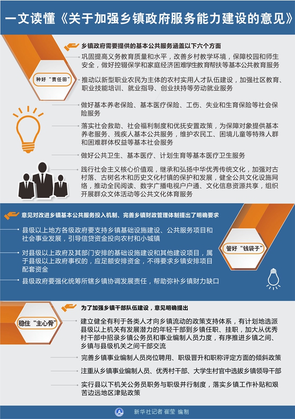 新形勢(shì)下,鄉(xiāng)鎮(zhèn)政府的基本公共服務(wù)職責(zé)有哪些?如何管好鄉(xiāng)鎮(zhèn)政府的“錢袋子”?如何為基層干部“強(qiáng)筋健骨”,穩(wěn)住鄉(xiāng)鎮(zhèn)的“主心骨”?中共中央辦公廳、國務(wù)院辦公廳近日印發(fā)《關(guān)于加強(qiáng)鄉(xiāng)鎮(zhèn)政府服務(wù)能力建設(shè)的意見》,對(duì)加快鄉(xiāng)鎮(zhèn)政府職能轉(zhuǎn)變等提出了新目標(biāo)、新任務(wù)、新要求。
