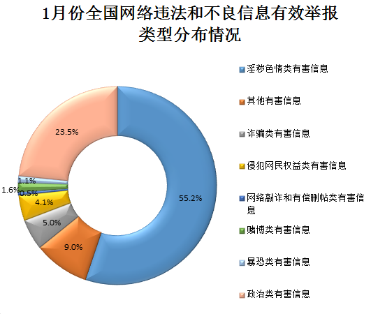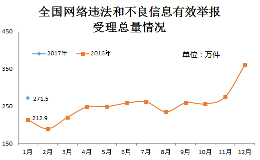 2017年1月,全國各地網信辦、各網站積極采取有力措施,進一步強化網絡舉報工作,受理違法和不良信息舉報共407.2萬件,同比增長約54.9%。經審核,有效舉報271.5萬件。
