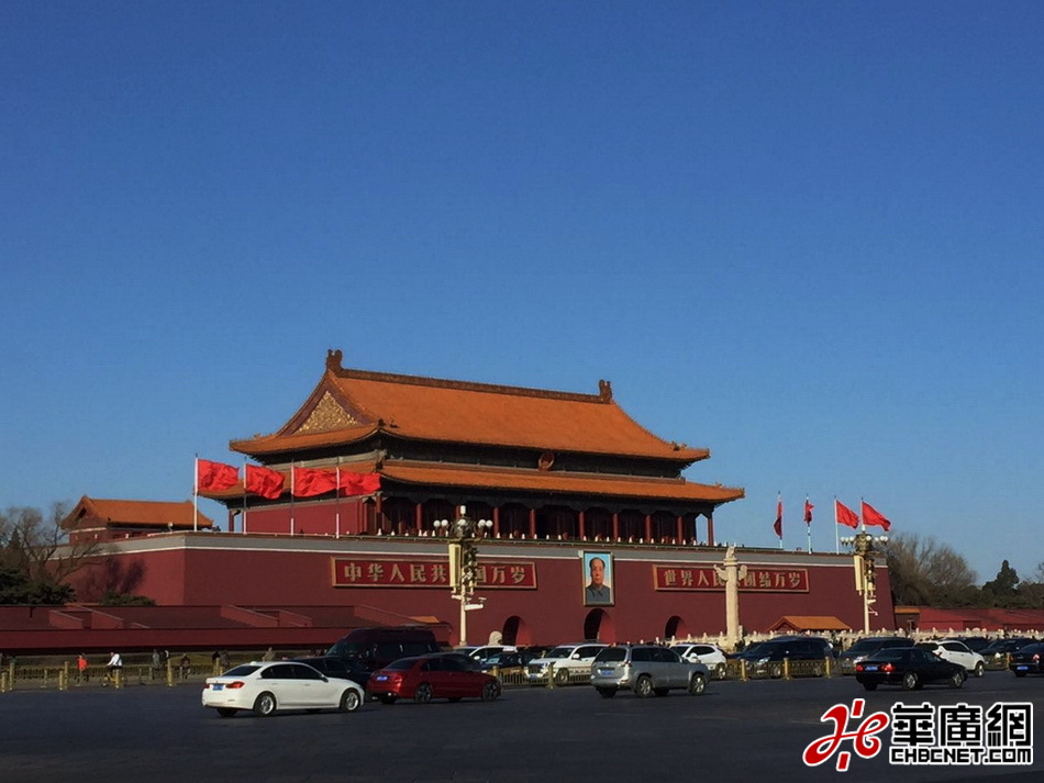 藍天下,天安門城樓莊嚴肅穆,靜待全國兩會開幕。陶寧薇攝