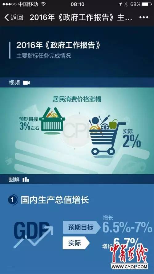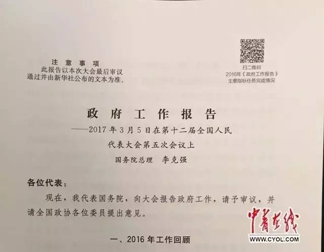 來自人民大會堂的最新消息:今年的政府工作報告有了視頻版!二維碼被印到了政府工作報告首頁的右上角,用手機掃一掃,出現了一個活潑的H5頁面。點擊播放,2016年政府主要指標任務完成情況以動畫視頻形式一覽無余。同時,視頻中的對比數據還以靜態圖片呈現,讓人大代表、政協委員、公眾直觀和從容地了解政府的工作。