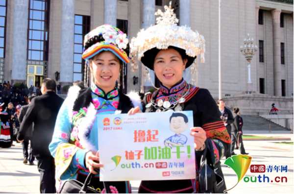 全國人大代表王安蘭(左)為“擼起袖子加油干!”點贊。中國青年網 劉洪俠攝