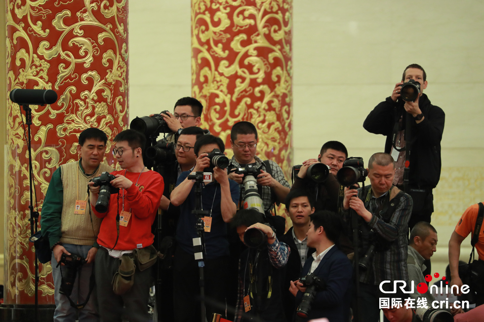 為了搶占有利地勢,記者們不惜在會場外通宵排隊,現場內更是長槍短炮云集,掀起媒體大戰。甚至在階梯背后,也有媒體工作人員席地而坐聆聽總理發言、忙碌工作的身影。