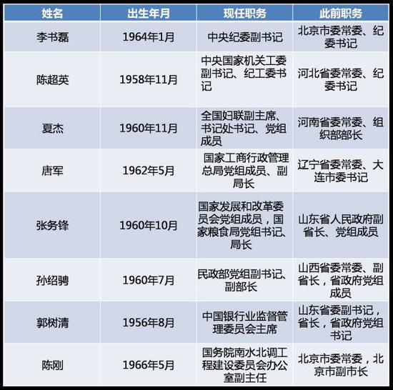 今年1月份,李書磊在經(jīng)過閩、京兩地歷練之后,調(diào)任中紀(jì)委,出任中紀(jì)委副書記。接著,時任河北省委常委、紀(jì)委書記陳超英進京任職,履新中央國家機關(guān)工委副書記、紀(jì)工委書記。2月份,時任河南省委常委、組織部部長夏杰調(diào)任全國婦聯(lián)副主席。