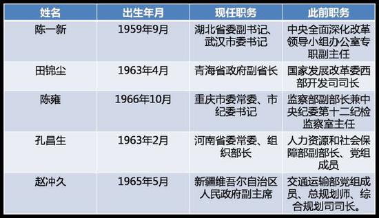 與此同時,今年5人從中央“空降”至湖北、青海、重慶、河南、新疆五省份黨政領(lǐng)導(dǎo)班子。其中,現(xiàn)任湖北省委副書記、武漢市委書記陳一新和現(xiàn)任重慶市委常委、紀(jì)委書記陳雍在此次調(diào)任之前都曾在地方工作幾十年,基層經(jīng)歷豐富。現(xiàn)任河南省委常委、組織部長孔昌生長期在人社部工作,曾有過山西、貴州兩地掛職經(jīng)歷。而青海省副省長田錦塵和新疆維吾爾自治區(qū)政府副主席趙沖久均為第一次赴地方任職,調(diào)任之前一直在中央單位任職。(作者:姚茜)