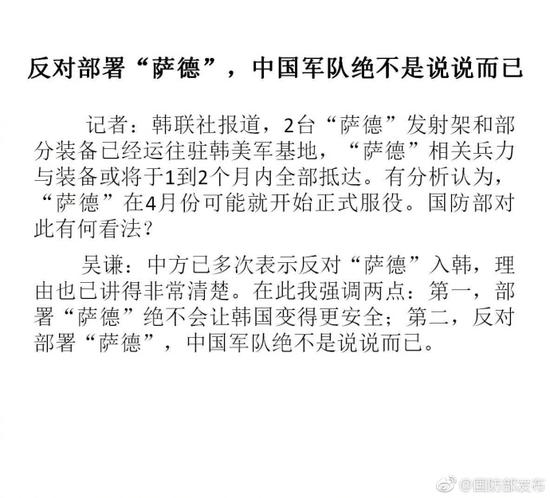 吳謙:中方已多次表示反對(duì)“薩德”入韓,理由也已講得非常清楚。在此我強(qiáng)調(diào)兩點(diǎn):第一,部署“薩德”絕不會(huì)讓韓國(guó)變得更安全;第二,反對(duì)部署“薩德”,中國(guó)軍隊(duì)絕不是說說而已。