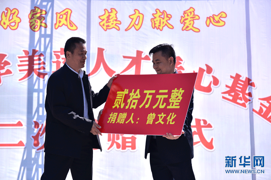 新華網南昌4月2日電(藍單 通訊員 蘭海洋 鐘慧燕)4月2日,全南中學校長鄭重接過“二十萬元”的捐贈牌,這筆愛心善款,來自該縣杰出鄉賢曾文化。他用這種特殊的方式寄托哀思追憶母親,替母親續交“特殊黨費”——給“美蓮人才愛心基金”增加20萬元捐款,以此度過一個“別樣的清明節”。