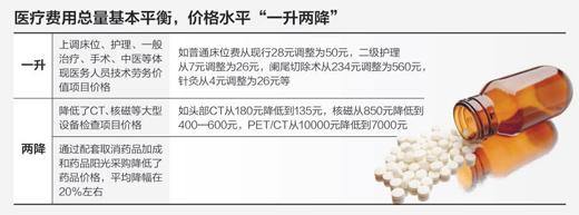 北京市衛(wèi)生計(jì)生委新聞發(fā)言人高小俊介紹說,調(diào)整后患者費(fèi)用總體負(fù)擔(dān)水平?jīng)]有增加。改革保持全市醫(yī)療費(fèi)用總量基本平衡,價(jià)格水平“一升兩降”:上調(diào)床位、護(hù)理、一般治療、手術(shù)、中醫(yī)等體現(xiàn)醫(yī)務(wù)人員技術(shù)勞務(wù)價(jià)值項(xiàng)目?jī)r(jià)格;降低了CT、核磁等大型設(shè)備檢查項(xiàng)目?jī)r(jià)格;降低了藥品價(jià)格。高小俊舉例說,如普通床位費(fèi)從現(xiàn)行28元調(diào)整為50元,二級(jí)護(hù)理從7元調(diào)整為26元,闌尾切除術(shù)從234元調(diào)整為560元等;頭部CT從180元降低到135元,核磁從850元降低到400—600元,PET/CT從10000元降低到7000元;而通過配套取消藥品加成和藥品陽(yáng)光采購(gòu),藥品價(jià)格平均降幅20%左右。
