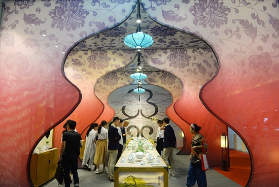 參觀者在中國景德鎮國際陶瓷博覽會上參觀(2016年10月18日攝)。擁有1700多年制瓷歷史的景德鎮,以其“白如玉、薄如紙、明如鏡、聲如磬”的瓷器制品享譽世界。自隋唐以來,景德鎮的陶瓷就是海上“絲綢之路”上的大宗商品。新華社記者 萬象/攝