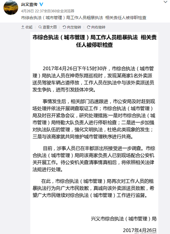 在此,興義市綜合執法(城市管理)局對工作人員的粗暴執法行為公開向廣大市民致歉,真誠向該外賣派送員致歉,表示希望廣大市民繼續對綜合執法(城市管理)工作進行監督。