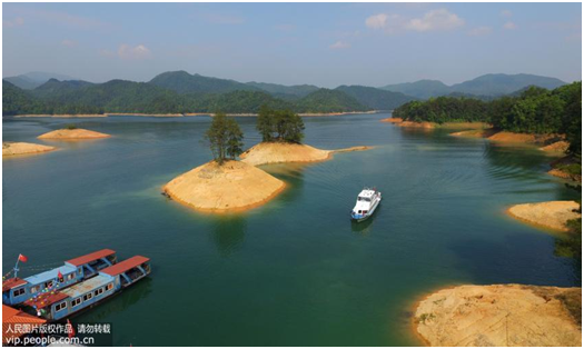 2017年5月20日,在江西省贛州市上猶縣陡水湖景區,一艘游船行駛在碧波蕩漾的湖面。近年來,上猶縣開展庫區綜合治理行動,良好的生態環境,有力助推了生態旅游產業發展。(鐘芳億攝/人民圖片)