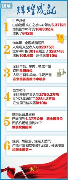 乘著扶持政策的“東風(fēng)”,衛(wèi)生事業(yè)發(fā)展成就矚目,人均預(yù)期壽命已升至75.8歲;教育事業(yè)快速發(fā)展,形成了覆蓋城鄉(xiāng)、層次齊全的現(xiàn)代化辦學(xué)體系;經(jīng)濟(jì)規(guī)模實(shí)現(xiàn)了“蝶變新生”,生產(chǎn)總值由自治區(qū)成立之初1947年的5.37億元增加到2016年的18633億元,增長(zhǎng)了642倍。
