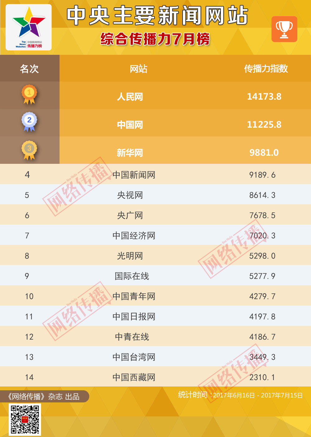 中央網(wǎng)信辦《網(wǎng)絡(luò)傳播》雜志傾力打造的“中央主要新聞網(wǎng)站傳播力2017年7月榜”今日發(fā)布。
