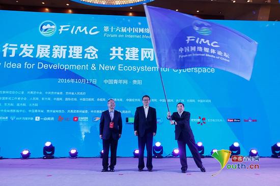 第十七屆中國網絡媒體論壇承辦方、中國經濟網總裁王旭東(右)揮舞著從國家互聯網信息辦公室網絡新聞信息傳播局局長姜軍(中)手中接過的旗幟。 中國青年網記者 張炎良 攝