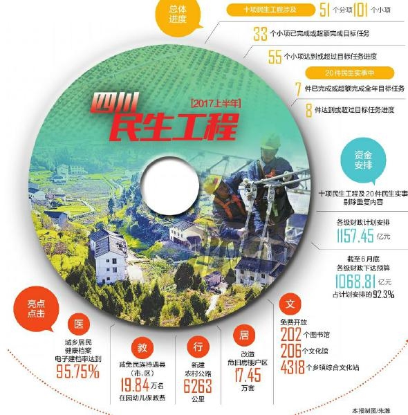 8月初,四川省政府督查室發(fā)布上半年四川省民生工程完成情況顯示,上半年十項(xiàng)民生工程涉及的51個(gè)分項(xiàng)101個(gè)小項(xiàng)中,有33個(gè)小項(xiàng)已完成或超額完成目標(biāo)任務(wù),55個(gè)小項(xiàng)達(dá)到或超過(guò)目標(biāo)任務(wù)進(jìn)度。20件民生實(shí)事中,有7件已完成或超額完成全年目標(biāo)任務(wù),8件達(dá)到或超過(guò)目標(biāo)任務(wù)進(jìn)度。