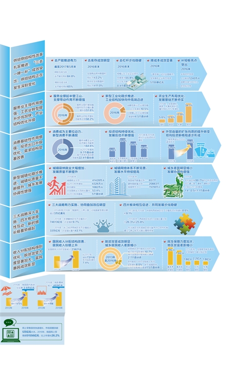 黨的十八大以來,在以習近平同志為核心的黨中央領導下,各地區各部門堅持以新理念引領經濟發展新常態,堅持穩中求進工作總基調,堅持以推進供給側結構性改革為主線,加快推動經濟結構戰略性調整和經濟轉型升級,國民經濟呈現結構改善、動力增強和質量提升的嶄新面貌,產業結構不斷優化,需求結構持續改善,新型城鎮化穩步推進,區域發展格局優化重塑,收入分配結構加快調整,發展的協調性和可持續性不斷增強。