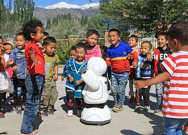 8月30日,拜城縣老虎臺鄉中心幼兒園的孩子在和機器人互動,充分感受科技的魅力。