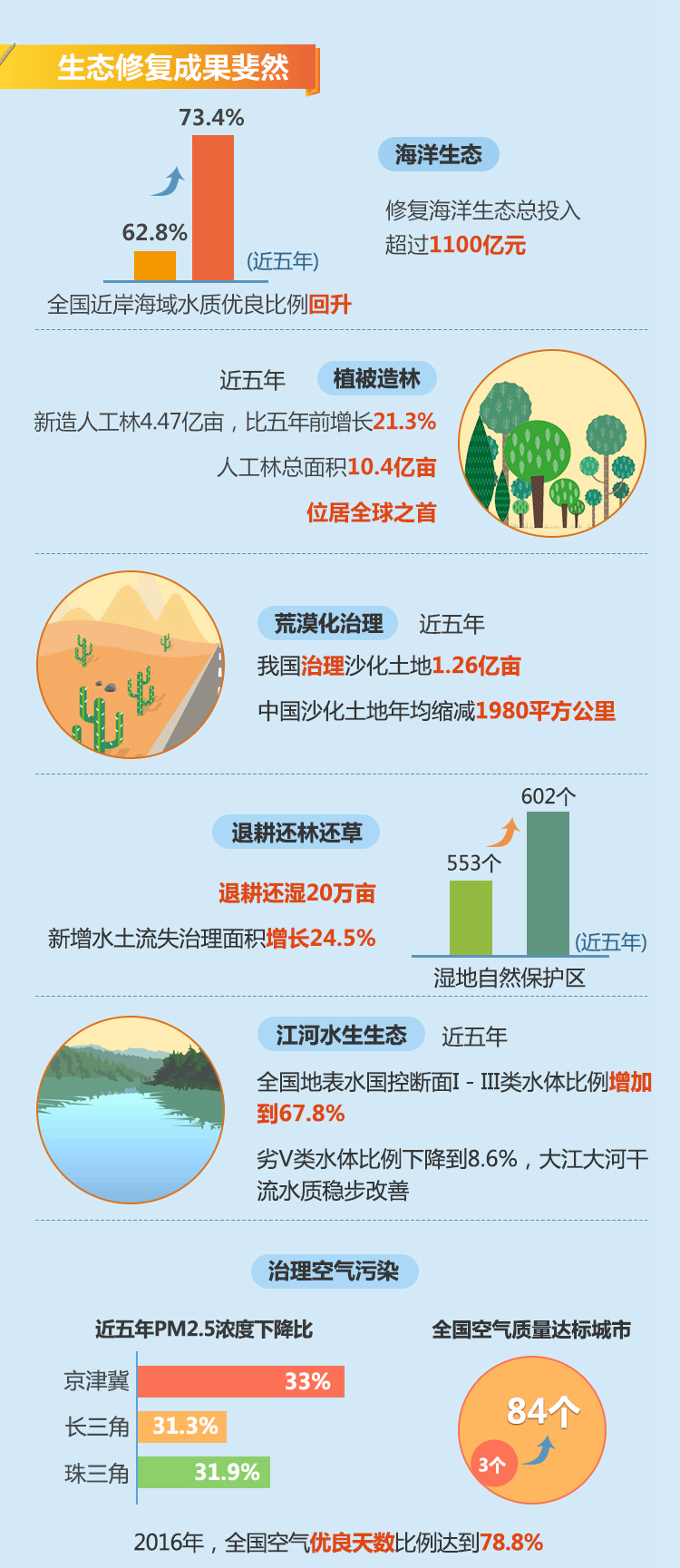 “綠水青山就是金山銀山”。這五年來,隨著綠色發展理念逐步融入中國人的生產生活,經濟發展與生態改善已經實現良性互動,綠色中國新圖景正在拉開帷幕。這五年,中國生態文明建設創造出哪些新成績,下圖將為你簡略概述: