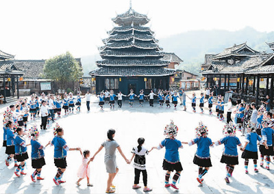 近年來,廣西三江侗族自治縣大力推進旅游扶貧工程,將侗族濃郁獨特的歌舞文化等民俗風情轉化為招攬游客的“法寶”。圖為在三江侗族自治縣林溪鎮冠洞村冠小屯,人們在歡跳多耶舞。