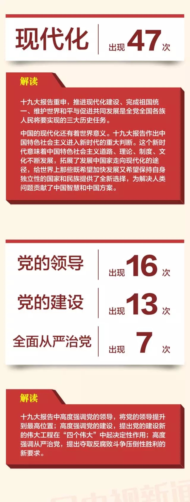 十九大報告中,許多重要關鍵詞被反復提及。“新時代”一詞首次出現(xiàn)在報告中,出現(xiàn)頻率也達到了30余次。此外,“中國特色社會主義”、“現(xiàn)代化”、“黨的領導”等詞也在報告中占據了重要的位置。