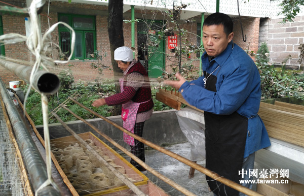 李儉康在為苧麻纖維上漿。(中國(guó)臺(tái)灣網(wǎng) 王文英攝)