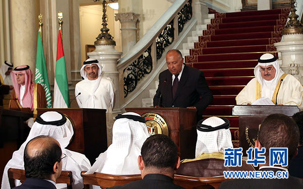2017年7月5日,在埃及首都開羅,埃及外長舒凱里(后右二)在四國外長會后的聯合記者會上宣讀聯合聲明。聯合聲明稱,卡塔爾對四國提出的13點要求的回復不能令人滿意。巴林、沙特阿拉伯、阿拉伯聯合酋長國、埃及6月5日分別宣布與卡塔爾斷絕外交關系,指責卡塔爾支持恐怖主義活動并破壞地區安全局勢。新華社發