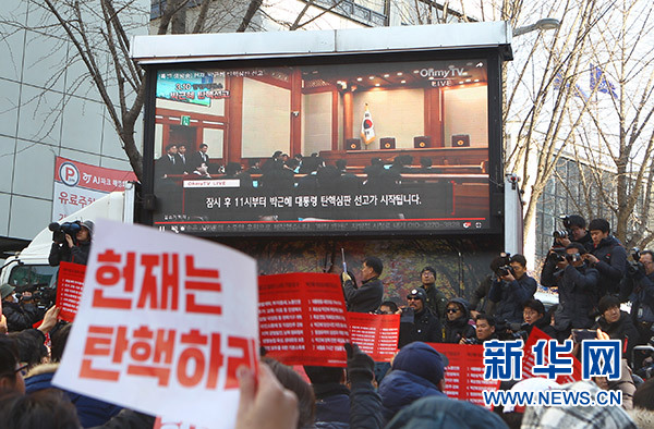 2017年3月10日,在韓國首爾憲法法院附近,反對樸槿惠的民眾高舉要求其下臺的標語。韓國憲法法院當日宣布贊成彈劾總統樸槿惠,樸槿惠成為韓國歷史上第一個被彈劾罷免的總統。新華社記者 姚琪琳 攝